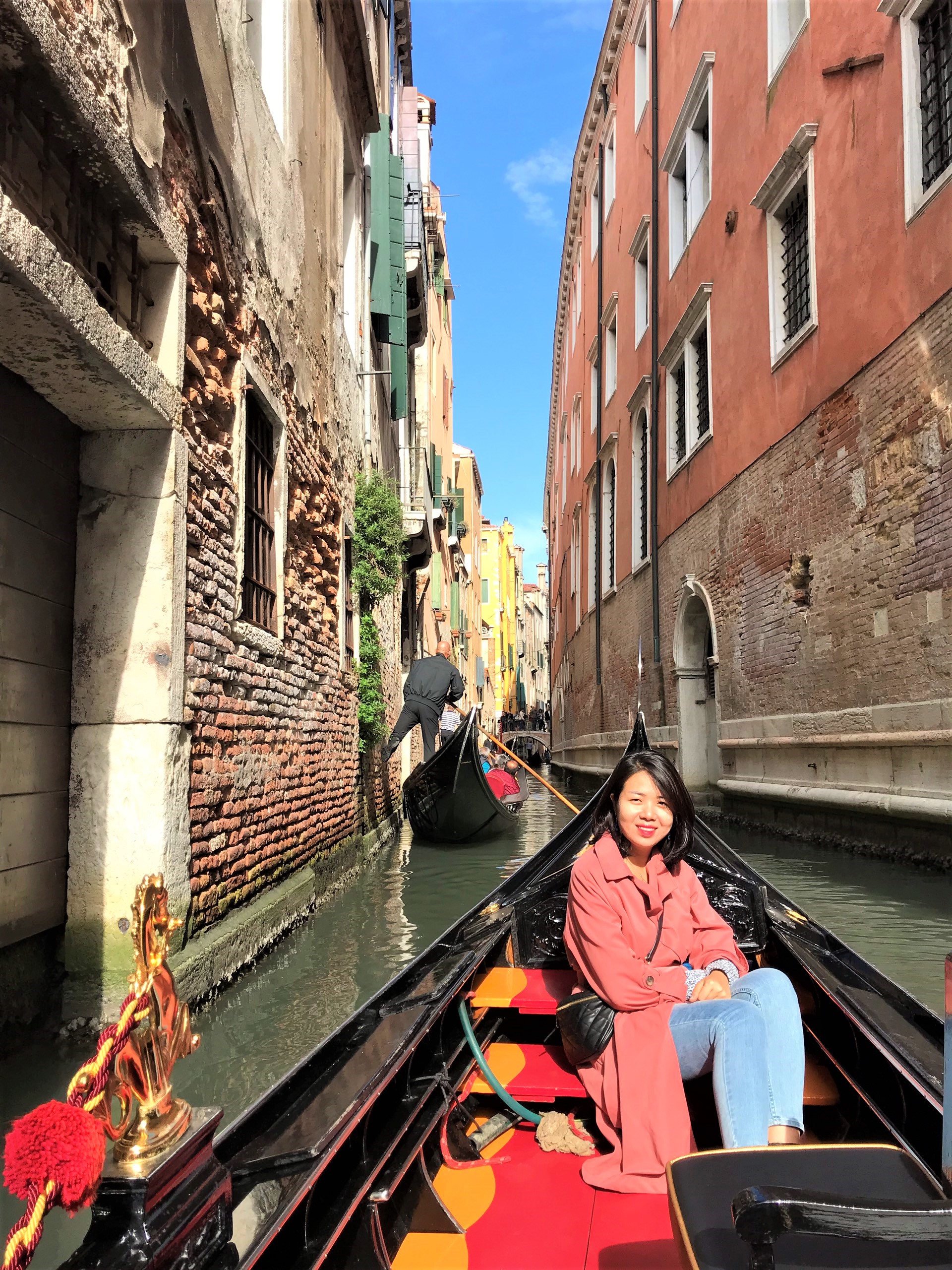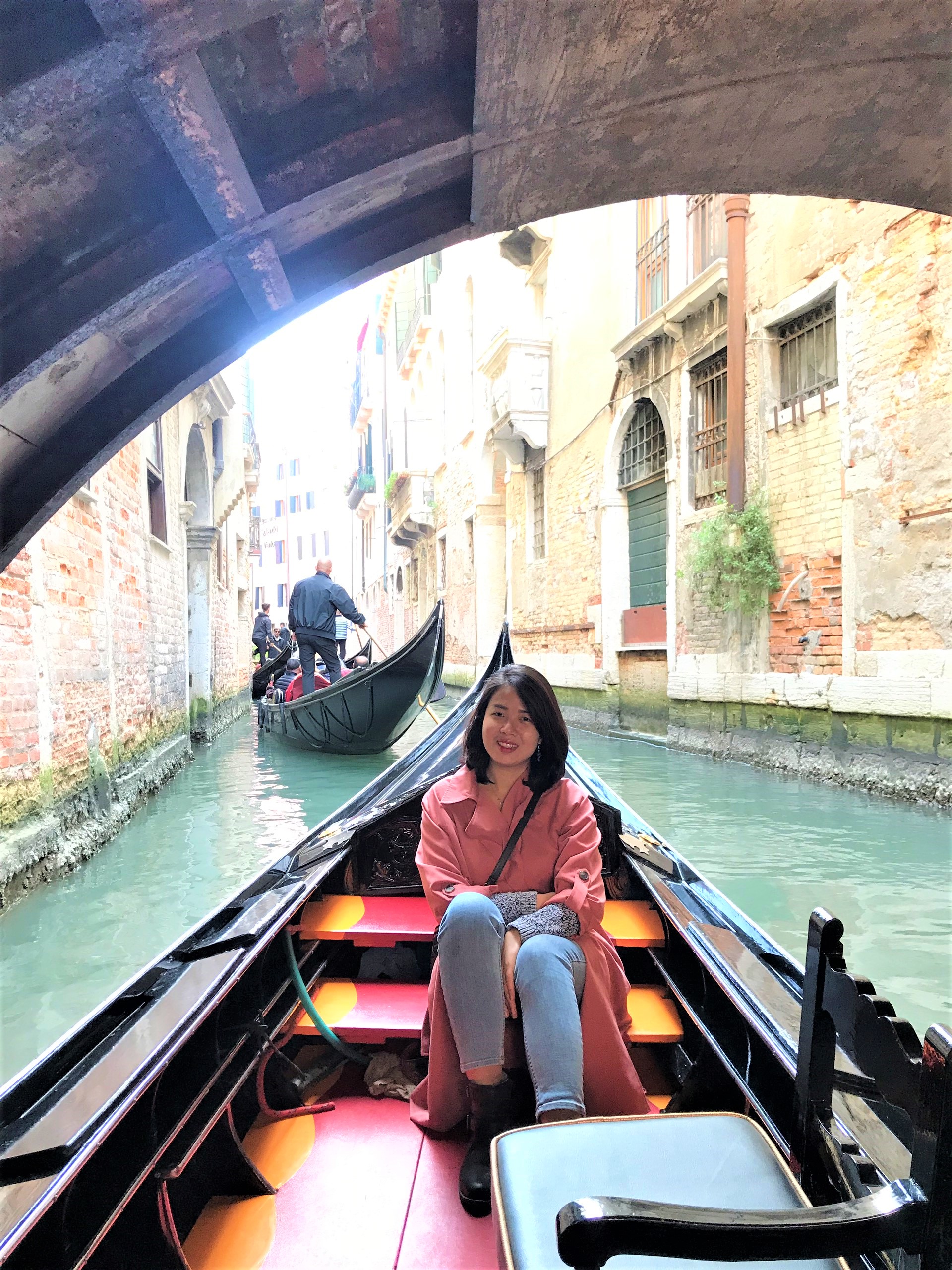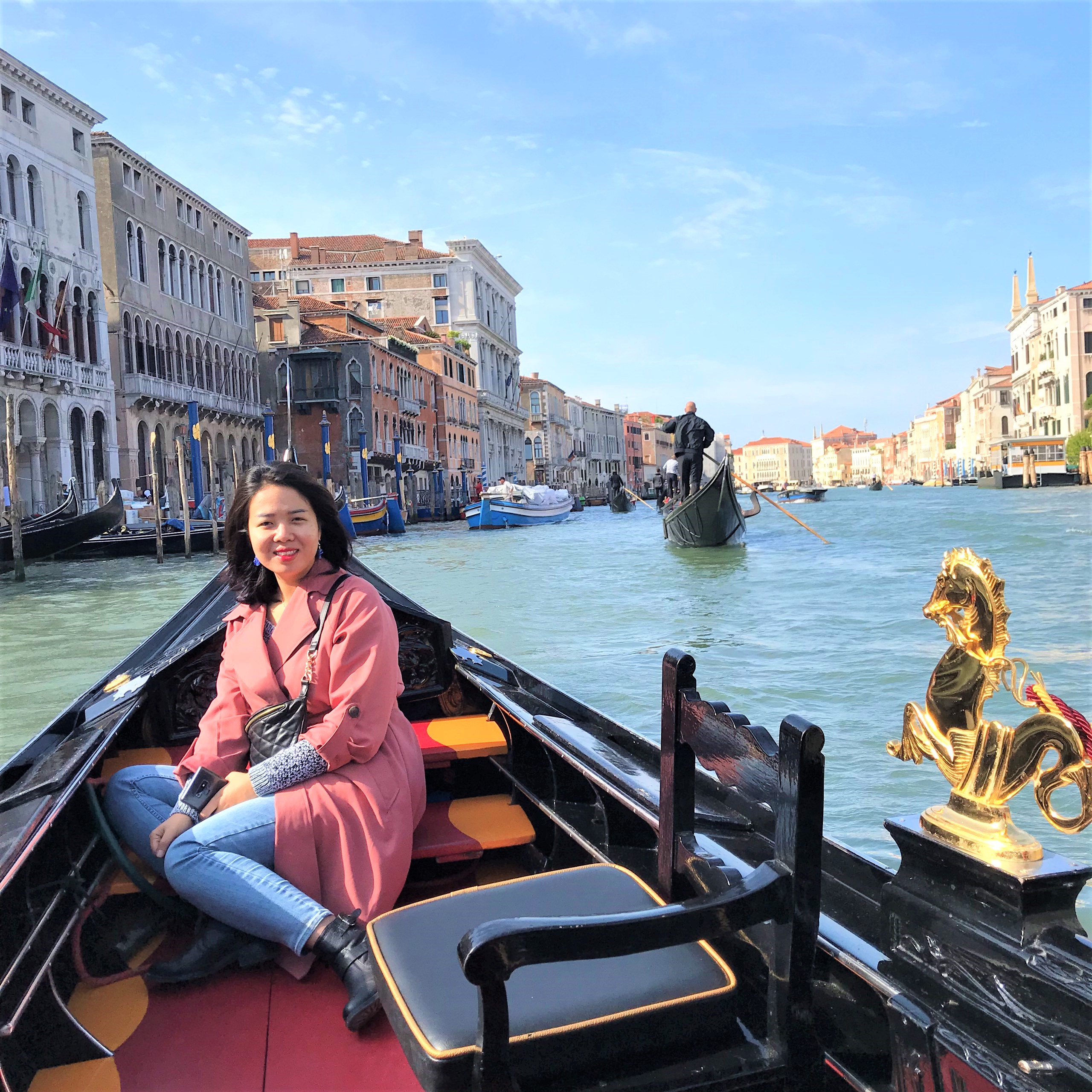 Đến Venice chắc chắn phải thử đi thuyền trên dòng sông, luồn lách qua những con phố nho nhỏ dù giá tiền trên trời luôn €80 cho 30′  nhưng là 1 trải nghiệm đáng để thử. Thuyền có thể chở max 6 người nên nếu đi đông bạn sẽ tiết kiệm hơn vì share cho nhau còn nhà mình có 2 người mà ko thích đi cùng người lạ nên chịu mắc 1 xíu. Bù lại, vì đi có 2 người nên có nhiều ảnh đẹp trên thuyền, ko bị vướng người (AQ 1 tí ạ )
