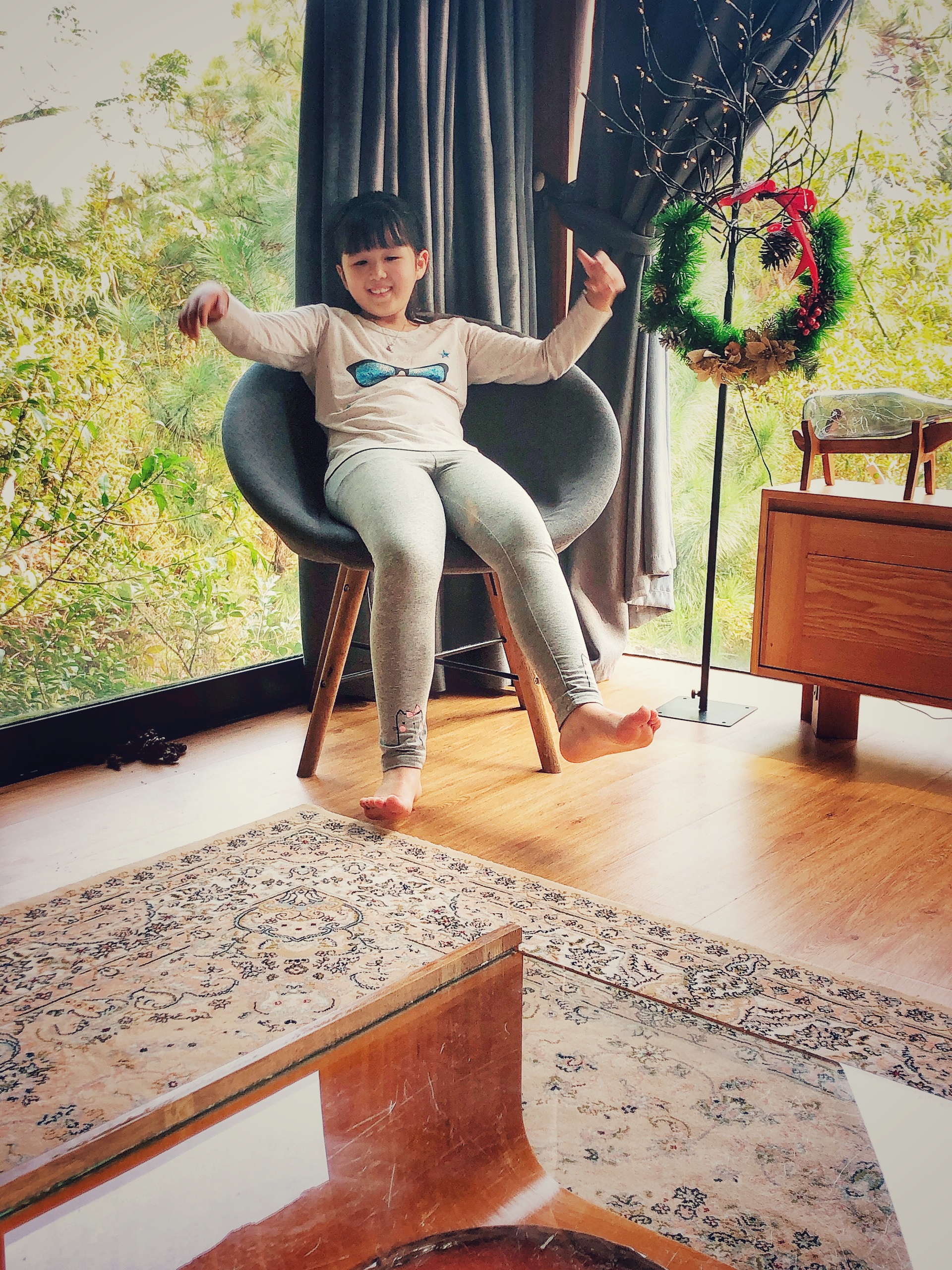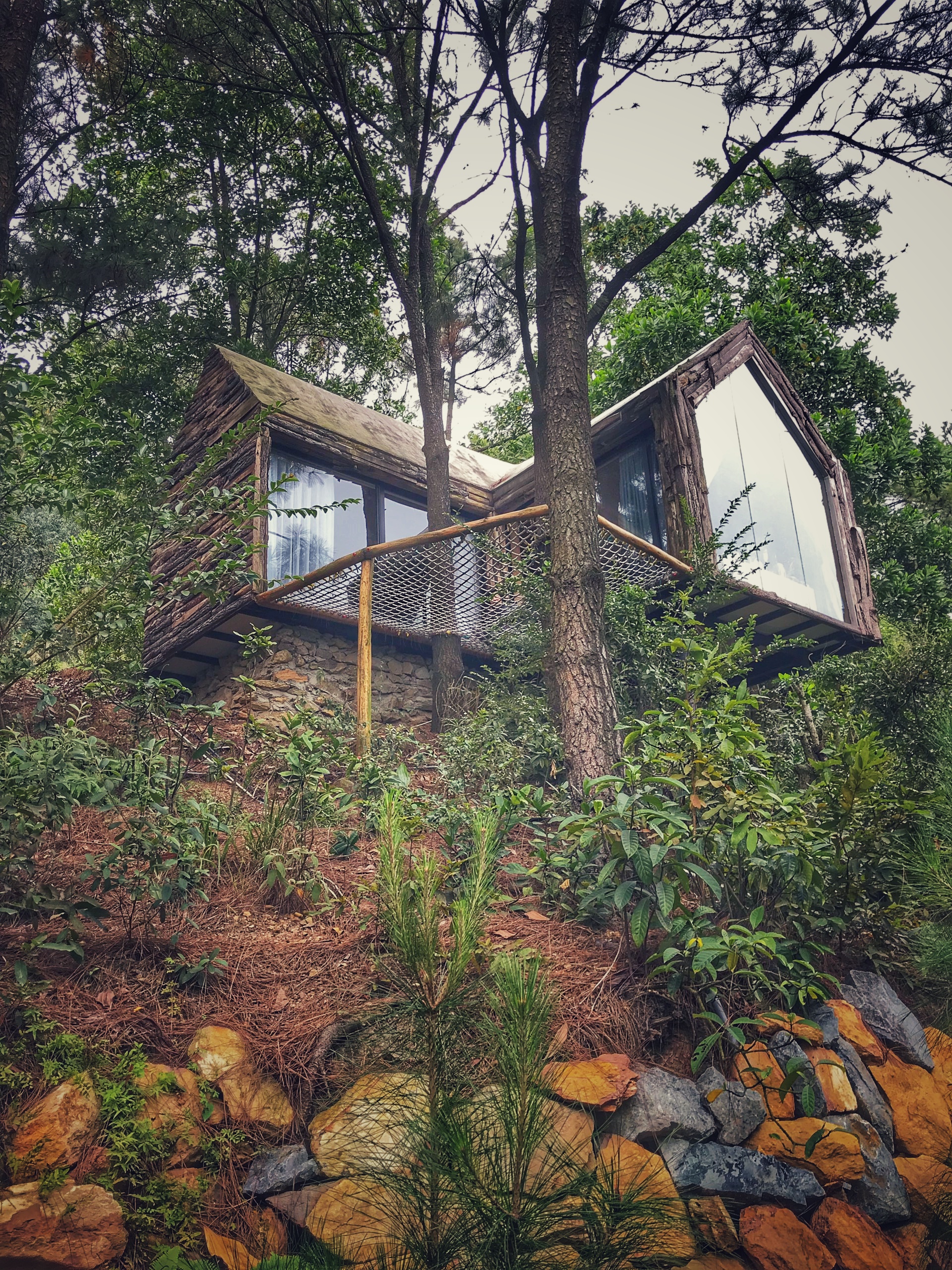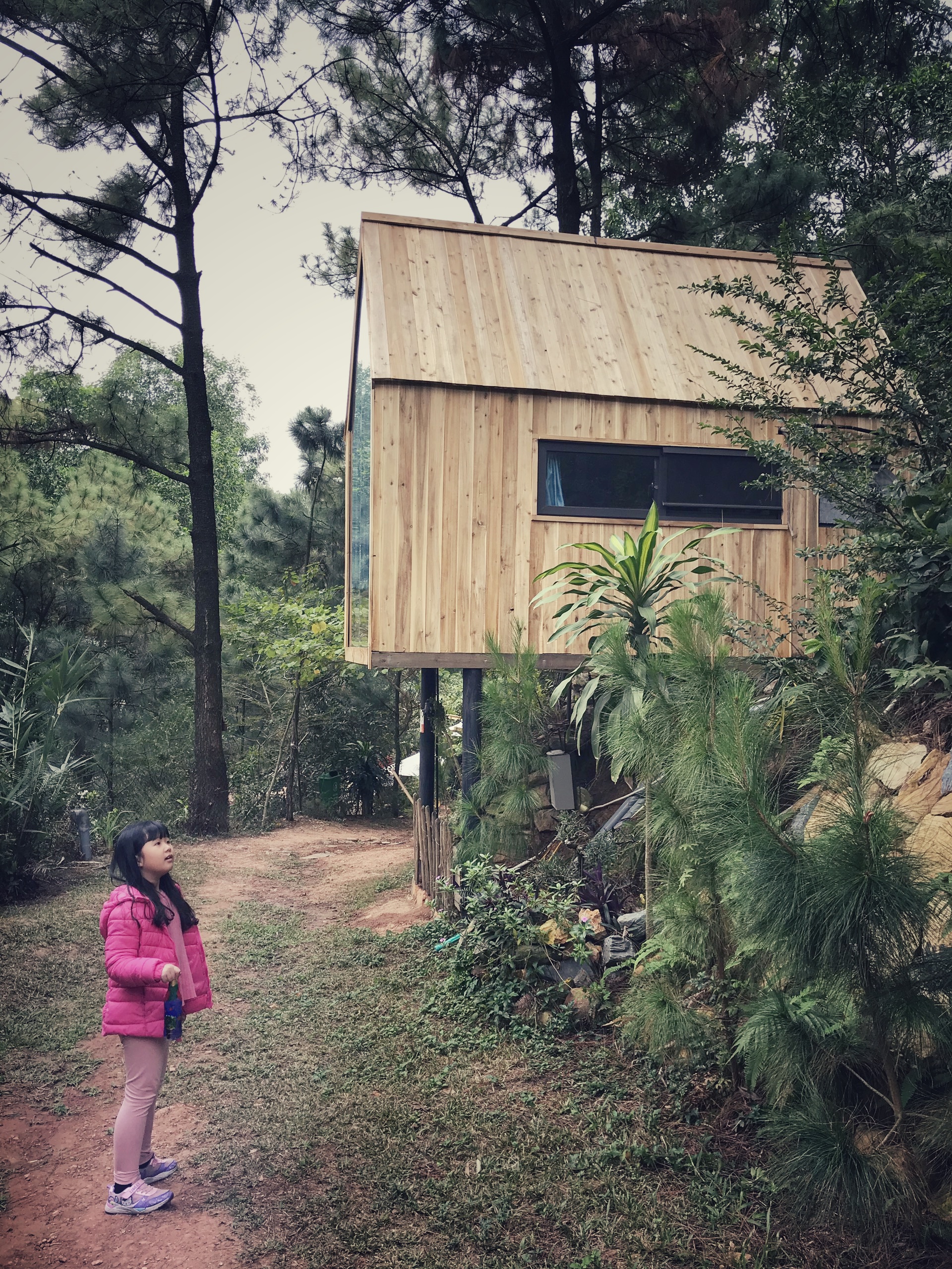 Căn nhà mình ở là 1 căn nhà gỗ lớn 2 phòng với những mảng kính lớn. Đặc biệt, bên ngoài có thiết kế 1 tấm lưới để nằm chơi ngắm cảnh rất thú vị.