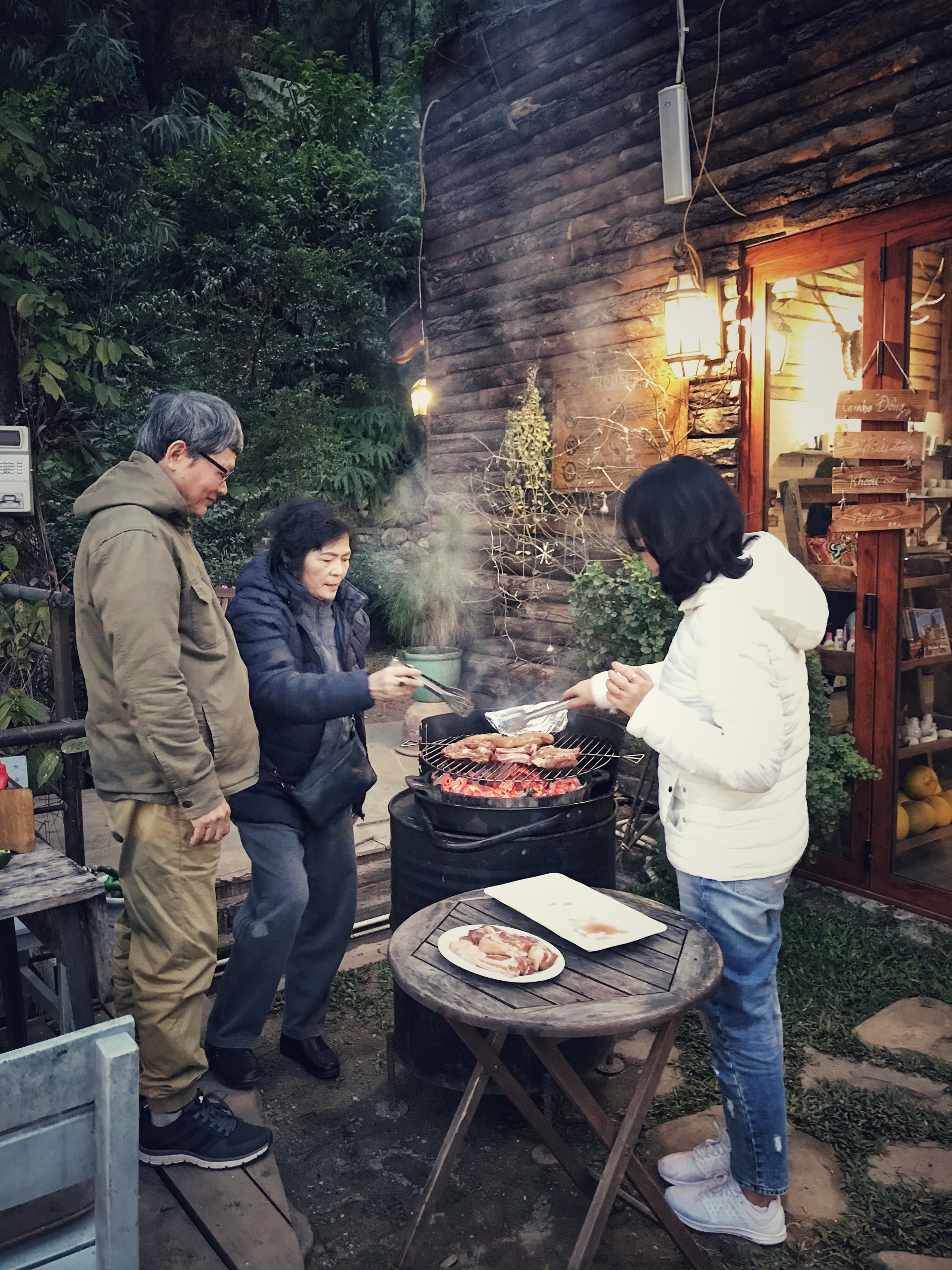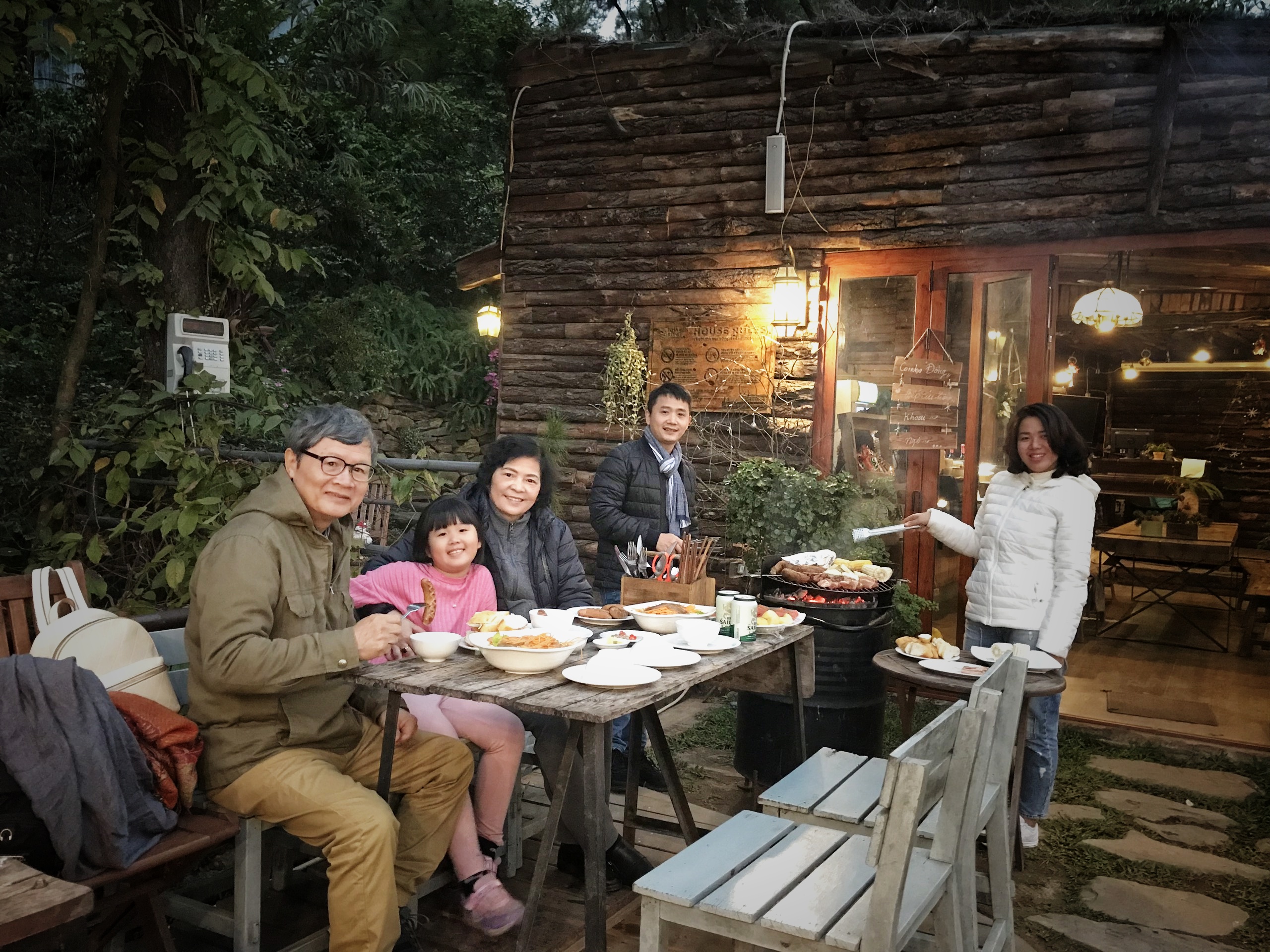 Trưa và Tối mình có thể gọi món hoặc đặt các set BBQ ngon lành. Chỉ với hơn 1,000,000VNĐ mà cả nhà 5 người ăn no luôn nhé. Set nướng gồm Sườn, Xúc xích, Thịt ba chỉ, Gà, Ngô, Khoai. Có kèm cả salad, bánh mỳ và trái cây tráng miệng nhé. Đồ nướng ở đây ướp miễn chê luôn. Trời lạnh, mà cả nhà quây quần bên bếp lửa hồng ấm cúng thưởng thức những bữa tiệc BBQ thơm lừng, ngon ngất ngây thì còn gì tuyệt hơn nữa nhỉ. À, đừng quên thử “Set lửa hồng” gồm ngô và khoai nướng trên bếp củi lớn thiệt lớn nhé. Vừa ngồi bên nhau nói chuyện, vừa sưởi ấm, vừa háo hức chờ ngô khoai chín thì cực kì thú vị luôn đó.
