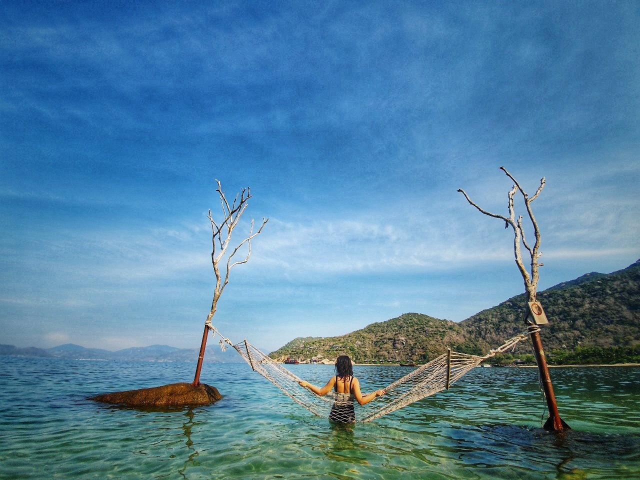 Vòng cung đảo quay hướng Tây nên bạn sẽ nhìn thấy mặt trời lặn thay vì mặt trời mọc như bình thường. Chính điều đó, thời điểm tốt nhất để bơi lại là buổi sáng đến tầm trưa do nước dâng lên. Chứ đến chiều nước rút thì cả bãi biển chỉ toàn san hô và sỏi đá, không làm ăn được gì đâu. Hôm đầu tiên nhà mình đến vẫn quen thói 4pm chạy ra biển xong méo mặt thất vọng vì cả bãi biển xấu òm, chả làm ăn gì được luôn í. Sáng hôm sau bơi thì ngon lành ngay. Nước trong vắt. Có điều nước lạnh nên phải làm quen 1 xíu thôi nè.
